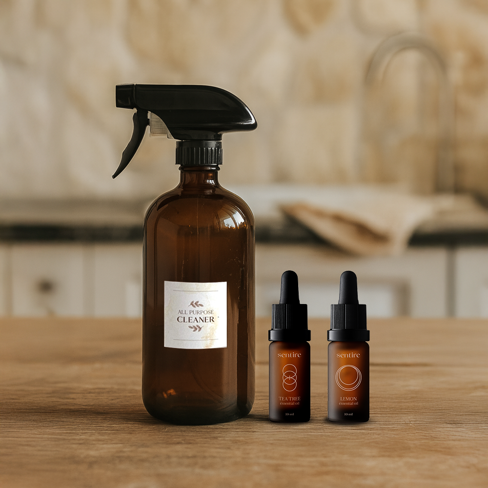 U setu dobivaš praznu staklenu bocu s raspršivačem te dva eterična ulja – limun i čajevac, savršen spoj za prirodnu dezinfekciju i svježinu.